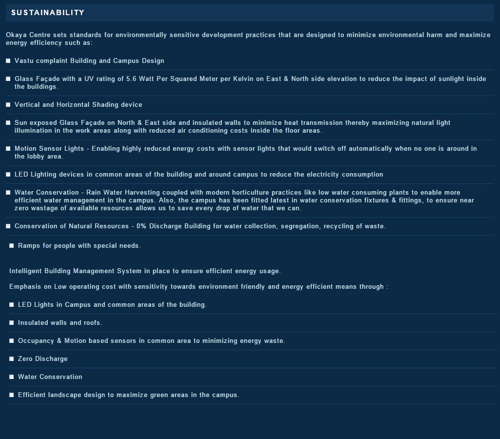 Fully Furnished Office space for Rent in Okaya Business Center Sector 62 Noida. Okaya Centre, the vastu compliant architecture is a Pre Certified LEED Gold Rated building which makes it energy efficient building designed with 100% LED lights, solar power generation and rain water harvesting. There Are Four Inter-connected Tower in Okaya bule silicon business park with Ground to 8 Story height each tower is having 4 high speed elevator and Ground -2 level reserved basement car parking with approx 750 car parking space. The state of art business centre is equipped with Integrated Business Management System (IBMS) and Energy Management System (EMS) to support the space. Business center is conveniently located in the established corporate district of sec 62, Business centre offers round the clock onsite technical assistance and planned amenities of ATM, food court, gymnasium and coffee shops. With an aim to offer a comprehensive office solution to the clients